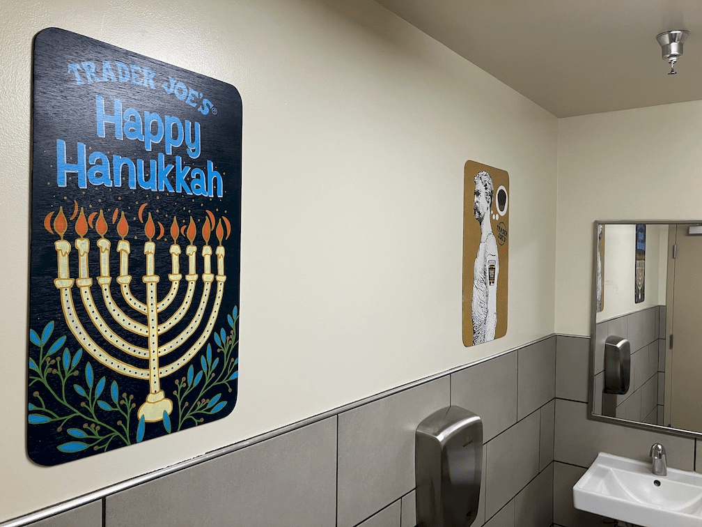 This is an easy fix, but it is reasonable to ponder why this was not caught before the print was placed on the bathroom wall in the first place. Thank you for applying the same care in this matter going forward that Trader Joe’s is known for. I look forward to a bountiful display of Jewish foods, wares, and symbols out on the display floor for the upcoming Passover and the next Hanukkah.