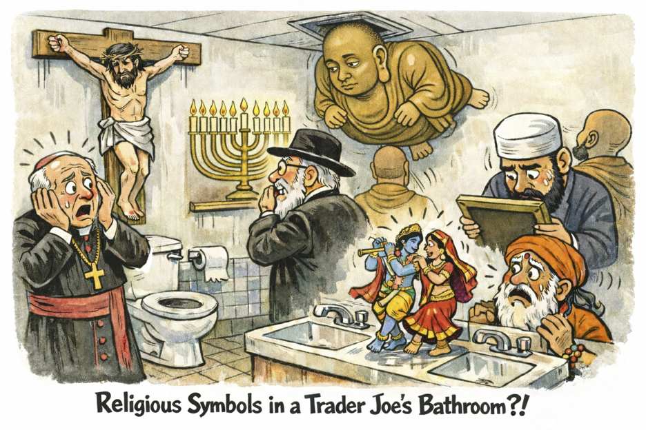 Perhaps one solution would be bringing symbols and images from several major world religions into the bathroom, to make it fair! It is worth asking, for each religion, how this would land. What if there were a crucifix mounted above the toilet? Or a painted portrait of the Prophet Mohammed (which, in many Muslim traditions, is itself considered offensive) on the wall? A Buddha stuck in the ceiling vent? Radha and Krishna dancing on the bathroom sink? Would any of those have made it past an internal review without anyone pausing to ask whether this was appropriate? Would those have been waved through as just cheerful, inclusive décor?