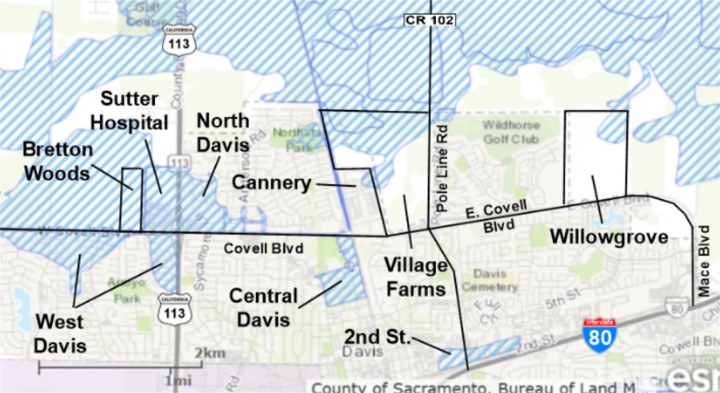As a result, Village Farms Davis will actually be more flood-resilient than almost all other subdivisions in Davis. Indeed, there are currently over 400 acres of existing housing in Davis that are still in the FEMA 100-year floodplain map including substantial areas in west, north, and central Davis as shown in the following map (the 100-year floodplain is shown in blue cross-hatching).