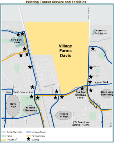 Fact No. 7 – Of course, any large development will bring increased traffic impacts as will Village Farms Davis once it is built out in 15 years +/-. However, the central location of the Project is within easy walking or biking distance of many destinations thus minimizing future commuting and intra-city automobile traffic. And, the location of Village Farms Davis is immediately adjacent to or within a short walk of 18 existing dedicated bus stops for six Unitrans (E, F, L, P, Q, and T) and two Yolo Bus (43 and 230) routes.