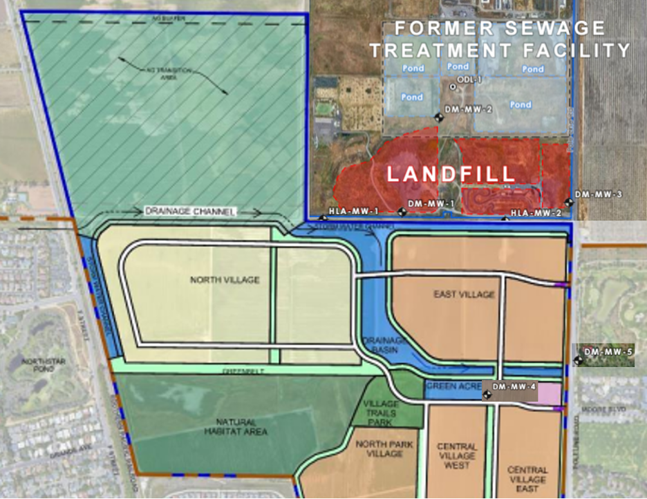 A key concern with the PFAS “forever chemicals” contamination documented at the project site is their presence in shallow groundwater and the potential for vapor intrusion. The extent of the PFAS shallow groundwater contamination has not been defined within the proposed development footprint adjacent to the landfill/burn site. However PFAS in the groundwater at the southern boundary of the Old Davis Landfill is as high as 1,600 parts per trillion (ppt) (measured in 2024), compared to 34 ppt in the groundwater under the middle of the Davis waste-water treatment plant (DWWTP) and 120 ppt in the DWWTP effluent (both estimated in 2021). PFOS, arguably the most toxic form of PFAS, is present at 1,500 ppt at the southern boundary of the Old Davis Landfill, 375-times higher than the target limit of 4 ppt in the DWWTP groundwater. The proposed drainage channel and residential property will be located within 100 ft of this location. The PFOS groundwater concentration was above this target limit on the Village Farms Property 1/3 of a mile away from its source at 39 ppt (measured in 2024). It is therefore highly likely that PFAS contamination is present in the shallow groundwater underlying the footprint of the proposed development south of the landfill/burn site.