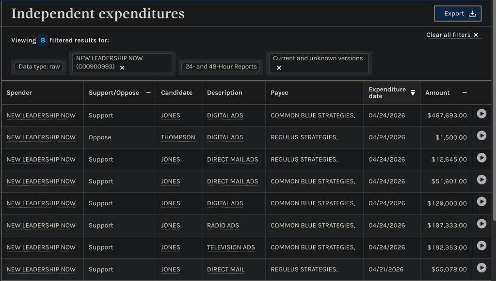 Expenditures for ads in support of Eric Jones’s campaign (mailers, TV, internet, etc.) from New Leadership Now currently exceed 1.1 million dollars, as this screenshot from the FEC website shows: