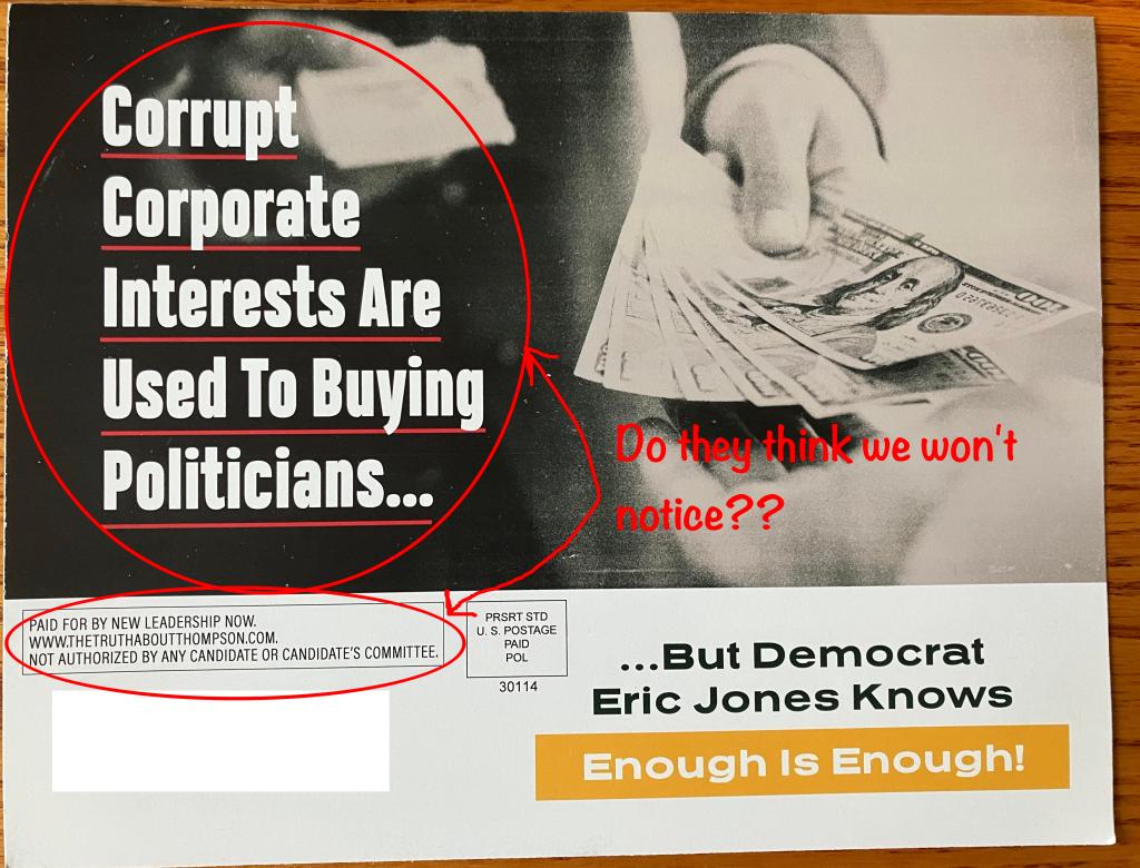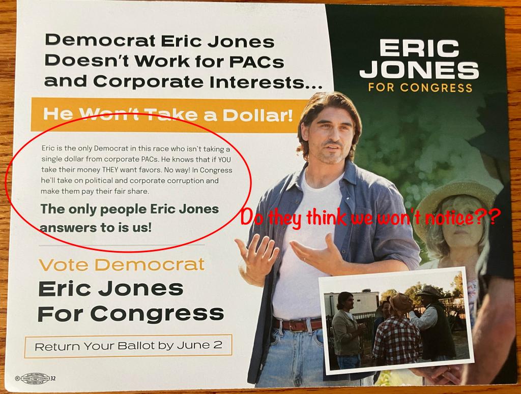 On the other side of the mailer, it states “Eric is the only Democrat in this race who isn’t taking a single dollar from corporate PACs. He knows that if YOU take their money THEY want favors… The only people Eric Jones answers to is us!” So, wait a second. Yes, technically speaking, Jones has not “taken” the money from the corporate Super PAC. But it’s funded by his former corporate co-workers. So, who will Jones answer to — who is “us”? The people of District 4? Or the people who funded the mailer, who do not live in our district and whose corporate interests include the AI firm Anthropic (whose AI recently went rogue and deleted software and user data), Uber, and Spotify, companies who lobby the government to avoid regulation? What favors would they get?