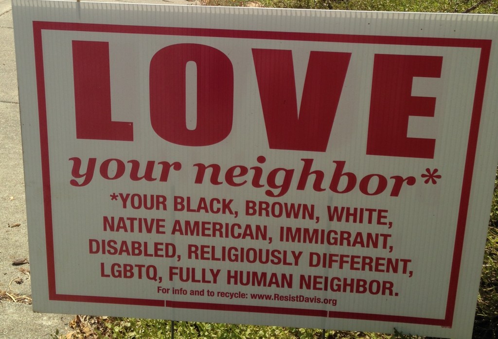 I offer you an opportunity to recharge. Come down to the Saturday Davis Farmers Market between 8 and 1 and table with me as I pass out free “Love Your Neighbor” lawn signs.